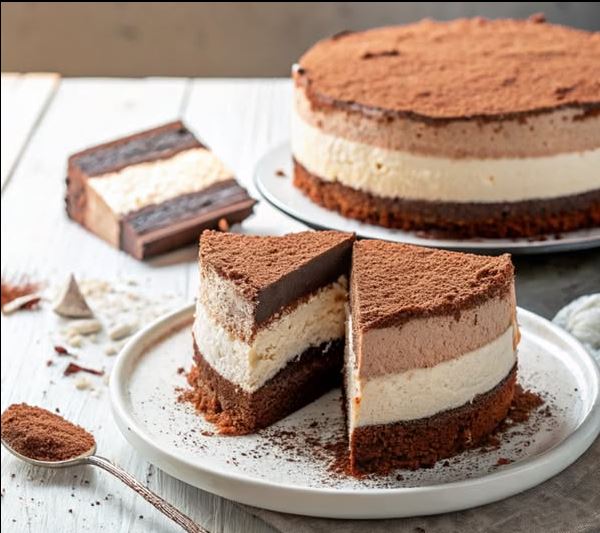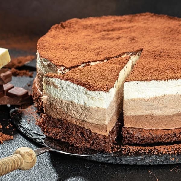 When sliced, the beautiful contrast of the three chocolate layers will make everyone’s eyes light up — and the taste will keep them coming back for seconds. 🍰✨